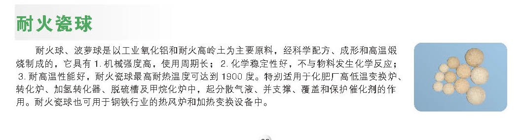 3. 耐高溫性能好,耐火瓷球高耐熱溫度可達到 1900 度。特別適用于化肥廠高低溫變換爐、轉(zhuǎn)化爐、加氫轉(zhuǎn)化器、脫硫槽及甲烷化爐中,起分散氣液、并支撐、覆蓋和保護催化劑的作用。耐火瓷球也可用于鋼鐵行業(yè)的熱風(fēng)爐和加熱變換設(shè)備中。耐火瓷球分普通耐火球和高鋁耐火球,普通耐火球適用于硫酸和化肥行業(yè)的轉(zhuǎn)化器和變換爐,高鋁耐火球適用于尿素、鋼鐵等行業(yè)的熱風(fēng)爐、加熱變換爐等設(shè)備。本站還有介紹陶瓷散堆填料。