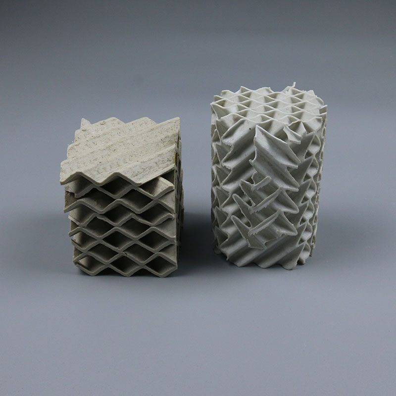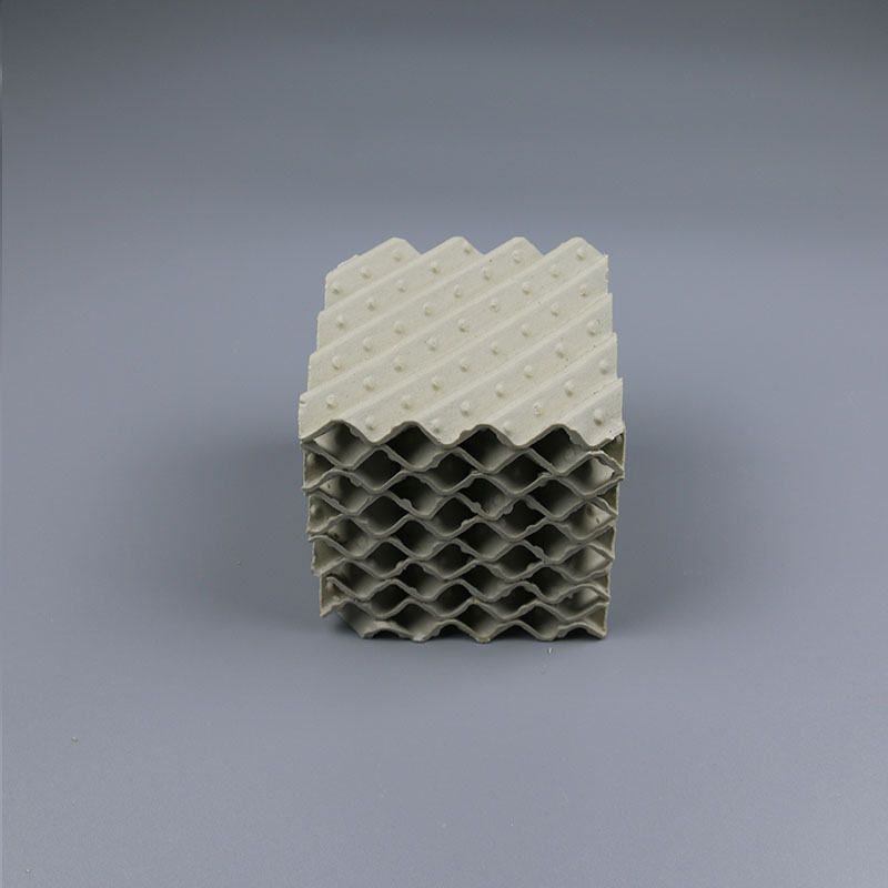 波紋規(guī)整填料目前工業(yè)上應(yīng)用的規(guī)整填料絕大部分為波紋填料,它是由許多波紋薄板組成的圓盤狀填料,波紋與塔軸的傾角有30°和45°兩種,組裝時(shí)相鄰兩波紋板反向靠疊。各盤填料垂直裝于塔內(nèi),相鄰的兩盤填料間交錯(cuò)0°排列。波紋填料按結(jié)構(gòu)可分為網(wǎng)波紋填料和板波紋填料兩大類,其材質(zhì)又有金屬、塑料和陶瓷等之分。